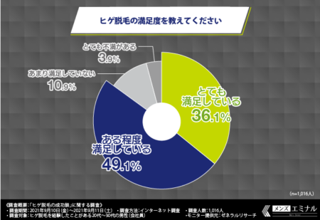 メンズエミナルの調査によると、ヒゲ脱毛に満足していると答えた方は約85%でした。