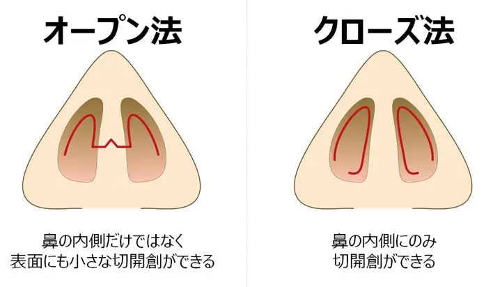 鼻に軟骨(耳の軟骨または医療用軟骨)を埋める手術には、大きく2つあります。1つは、オープン法、もう1つはクローズ法です。